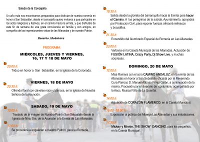 Como cada año, se acerca la Romería de San Sebastián, este 2018, os presentamos el programa de actos de este mayo festivo, que la Concejalía ha elaborado para en colaboración de la Cofradía de San Sebastián y la Parroquia de Nuestra Señora de la Asunción, llevar a cabo una jornada de convivencia romera en el Paraje de las Allanadas entre todas las personas que siguen con fe a nuestro patrón San Sebastián, de modo que sea un motivo de fiesta y alegría entre todos.