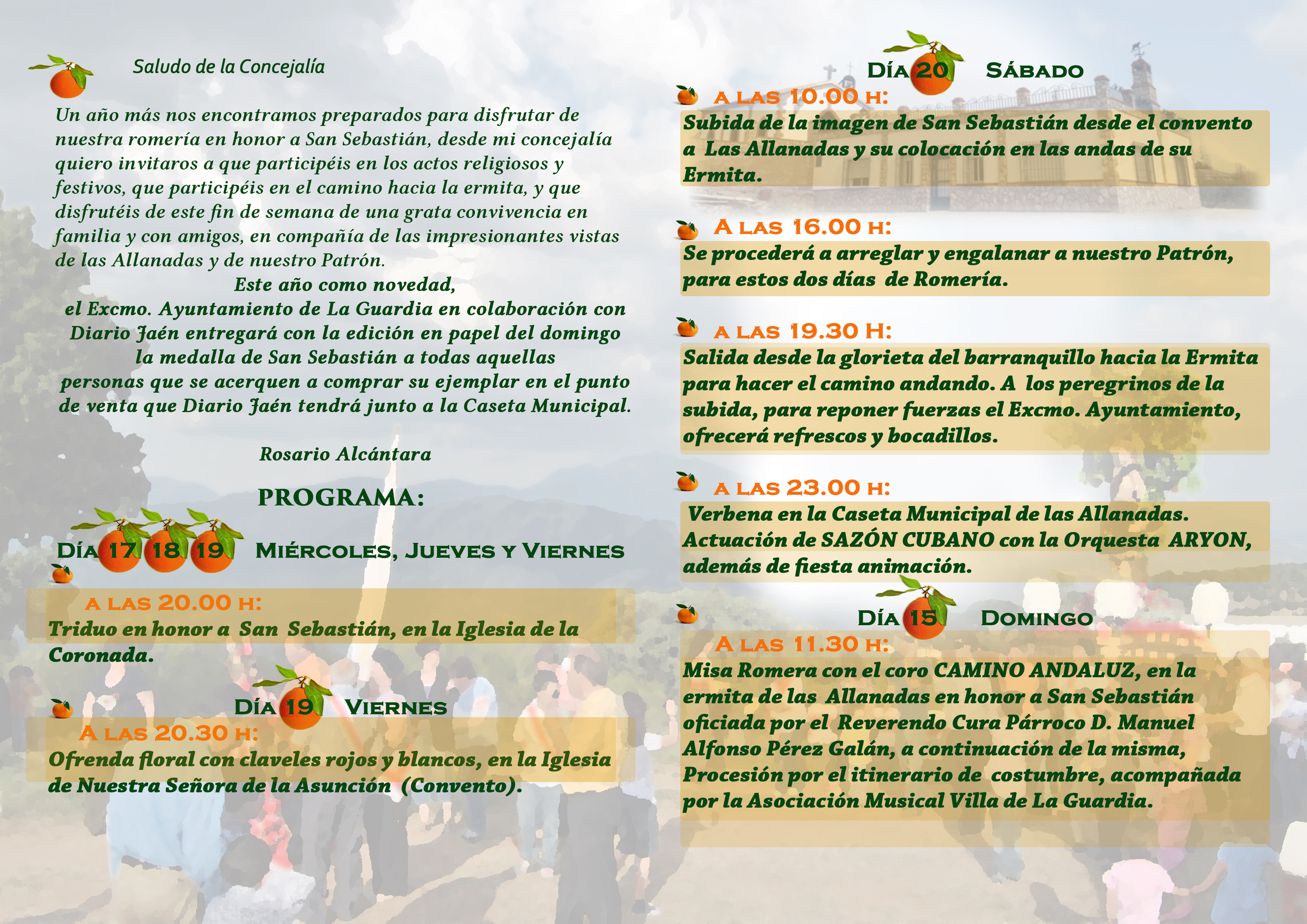 Os invitamos a celebrar la Romería de San Sebastián 2017, de la que os presentamos la programación que hemos preparado desde la Concejalía de Festejos en colaboración con la Cofradía de San Sebastián y nuestra Parroquia, deseando sea un fin de semana de convivencia vecinal, fiesta y alegría en el Paraje de las Allanadas de San Sebastián.