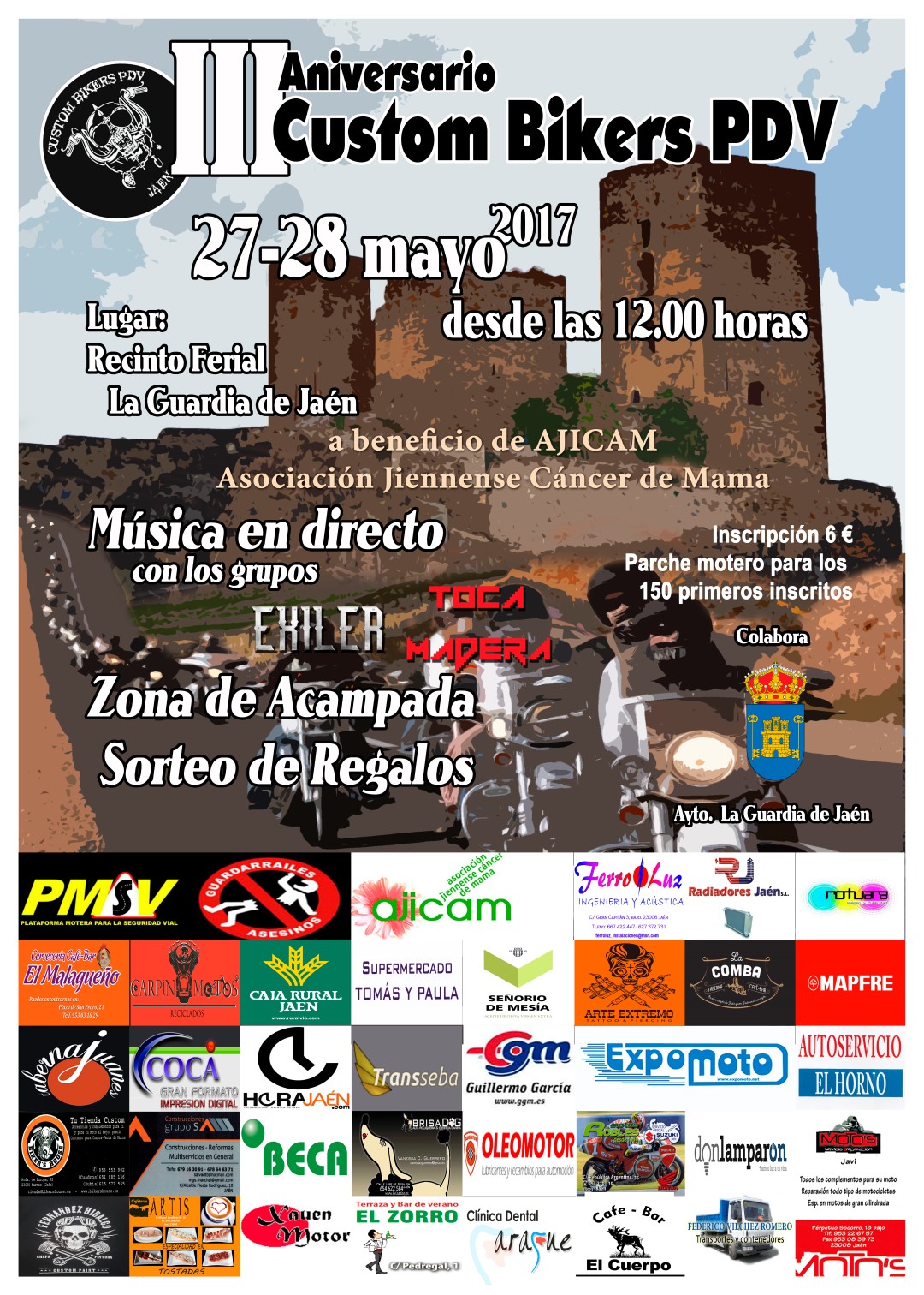 Esta misma mañana, en el Ayuntamiento de La Guardia de Jaén, ha tenido lugar la presentación del III Aniversario Custom Bikers PDV, concentración motera que se celebrará durante el próximo fin de semana en nuestro Recinto Ferial, y que organiza el Club Custom Bikers de Jaén con la colaboración del Excmo. Ayuntamiento de La Guardia de Jaén junto con la de otros muchos establecimientos y empresas locales y de Jaén. En el acto han estado presentes el Alcalde, Juan Morillo García, la Concejala de Cultura, Rosario Alcántara Muriana y los miembros del Club Custom Bikers PDV, Juan y Jesús.
